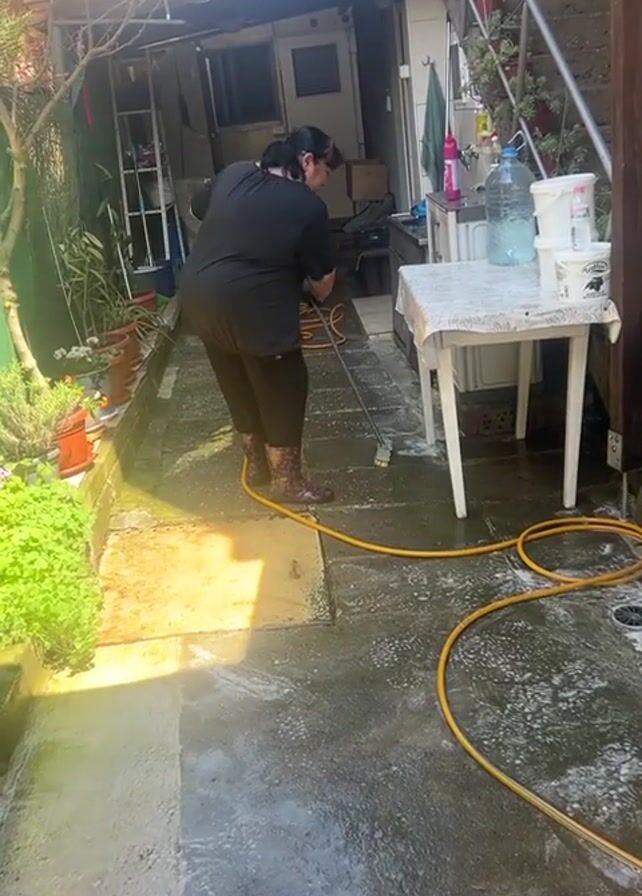 A middle-aged woman is seen cleaning a patio area. She is wearing dark clothes and brown rain boots. She is using a long handled scrub brush and a yellow water hose. The area is wet and foamy with soap. To her right is a small white table with cleaning supplies. To the left is a row of potted plants. In the background is a building with a set of stairs leading to an upper level. The sun is shining, causing shadows across the patio.