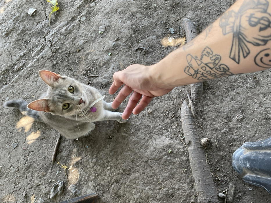 A gray cat with green eyes looks up at a hand reaching towards it. The cat wears a light collar with a purple tag. The background is a rough, gray surface, possibly dirt or concrete. A tattooed arm is visible in the upper right, with designs including a plane. A black boot is partially visible in the lower right corner. Several sticks or branches are scattered around the ground. The lighting is bright and natural.