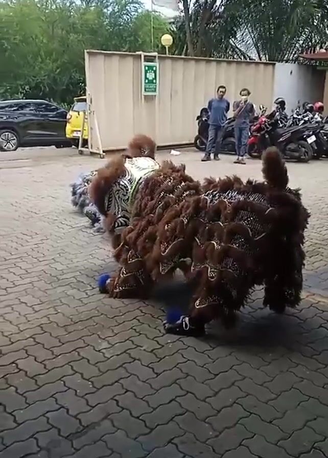 lion dance costume being maneuvered on a paved area with interlocking blocks. The costume is predominantly brown with white and black accents, and blue "feet" or paws. Two people are standing near a building and a row of parked motorcycles in the background, watching the lion costume. An Indonesian flag waves in the background. There is a light colored structure behind the people. The environment appears to be outdoors, possibly a parking lot or courtyard.