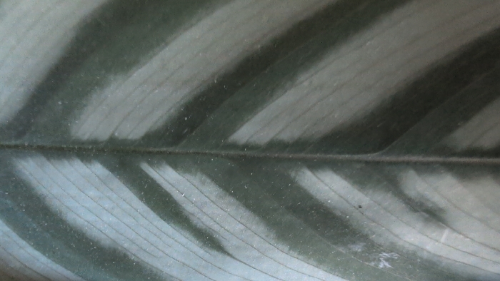 close-up of a green and white striped leaf. The leaf is smooth and has a slightly glossy surface. The stripes are diagonal and run from the top left to the bottom right of the image. The leaf is illuminated by a diffuse light source, which casts soft shadows on the surface of the leaf. The image is in focus and the texture of the leaf is clearly visible. This location is not specific to Wuppertal, Germany. No people, animals, or other objects are present in the image.