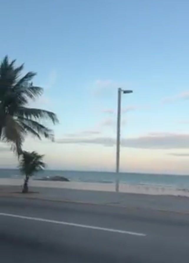 coastal scene with palm trees along a street and the ocean in the background. A two-lane road runs along the coastline, and two palm trees stand between the road and the beach. The sky is blue with scattered clouds, suggesting either dawn or dusk. The ocean is calm and stretches to the horizon. The camera appears to be moving, possibly from a vehicle driving along the road. The trees are swaying slightly in the wind.