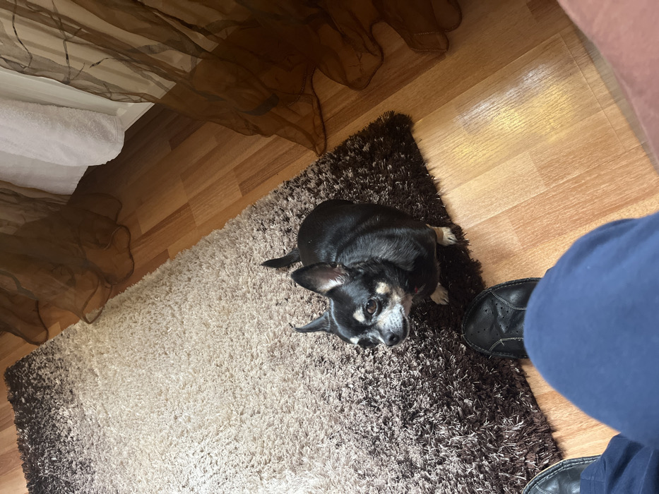 - "An indoor scene in Petrich, Bulgaria, captured from a high-angle perspective, shows a small, black-and-tan chihuahua-type dog standing on a shaggy rug" by FM-bcBuz2, licensed under CC BY 4.0