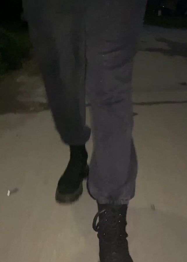lower portion of a person walking on a sidewalk or paved surface. The person is wearing dark, baggy pants and black, lace-up boots with a visible tread. The camera follows the person's feet as they walk. It appears to be nighttime, and the lighting is dim. There is a car parked in the background, and a street light is visible in the distance. The sidewalk is uneven in places. The person is speaking, but the content of the speech is unclear.