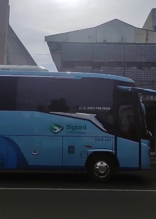 A series of blue Bigbird tour buses are parked in a row on the side of a street. The buses are parked alongside a sidewalk and feature advertisements for the Bigbird tour company. Signs for various businesses are visible in the background, including "QODHA AROMATIC" and "INDOGADAI." The sky is overcast and the light appears to be muted. The road is asphalt and marked with lane lines. The camera follows the line of parked buses and focuses on the details of the tour company and bus model.
