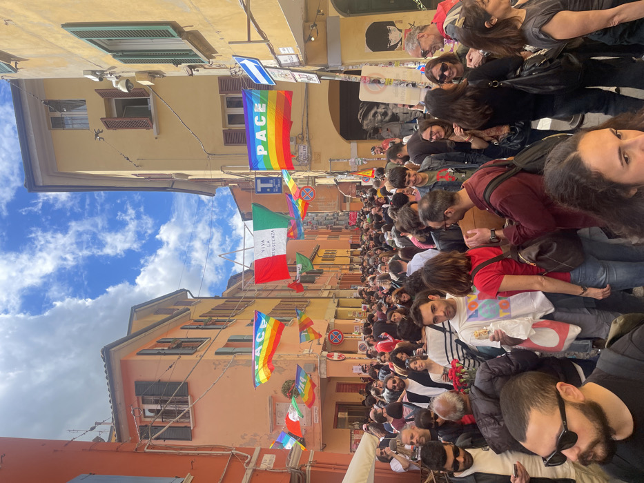 The scene takes place in a narrow street lined with tall, brightly colored buildings in Bologna, Italy, at the intersection of Via della Resistenza and Via del Borgo. The street is crowded with hundreds of people, mostly adults, many wearing colorful clothing. Many people are holding flags with rainbow-colored stripes that say "PACE", and some are carrying smaller flags or banners. Others are chatting, smiling, and taking pictures. The sky is bright blue with a few white clouds, and there is a warm, sunny feel to the atmosphere. The people are likely attending a peaceful demonstration or celebration.