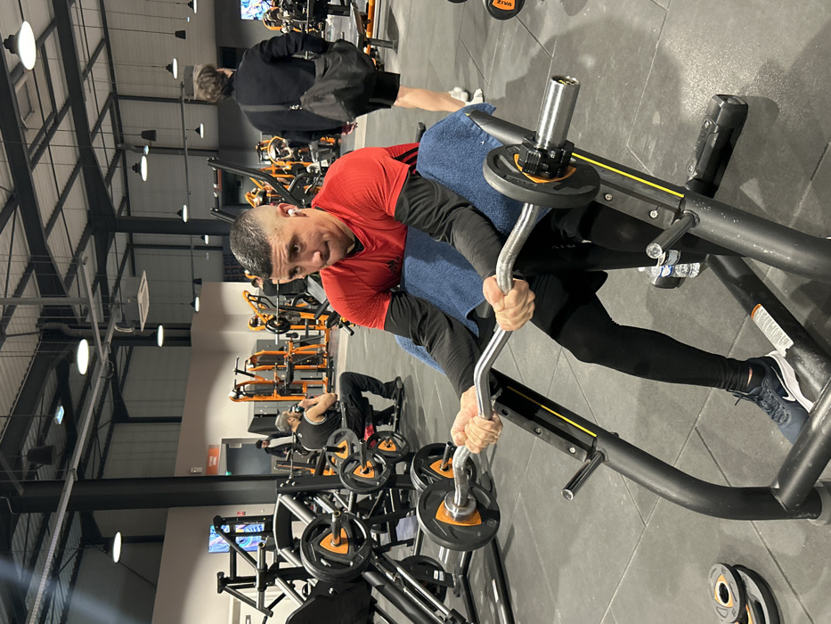 - "In a brightly lit gym, a man in a red t-shirt and black leggings lifts a barbell on a preacher curl machine" by FM-LY5HE3, licensed under CC BY 4.0