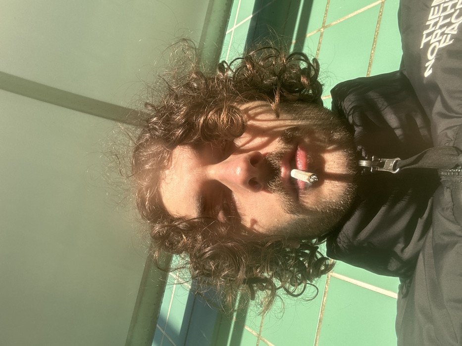 A male individual with dark brown, curly hair and a mustache and beard is depicted in a close-up, upward-angled shot