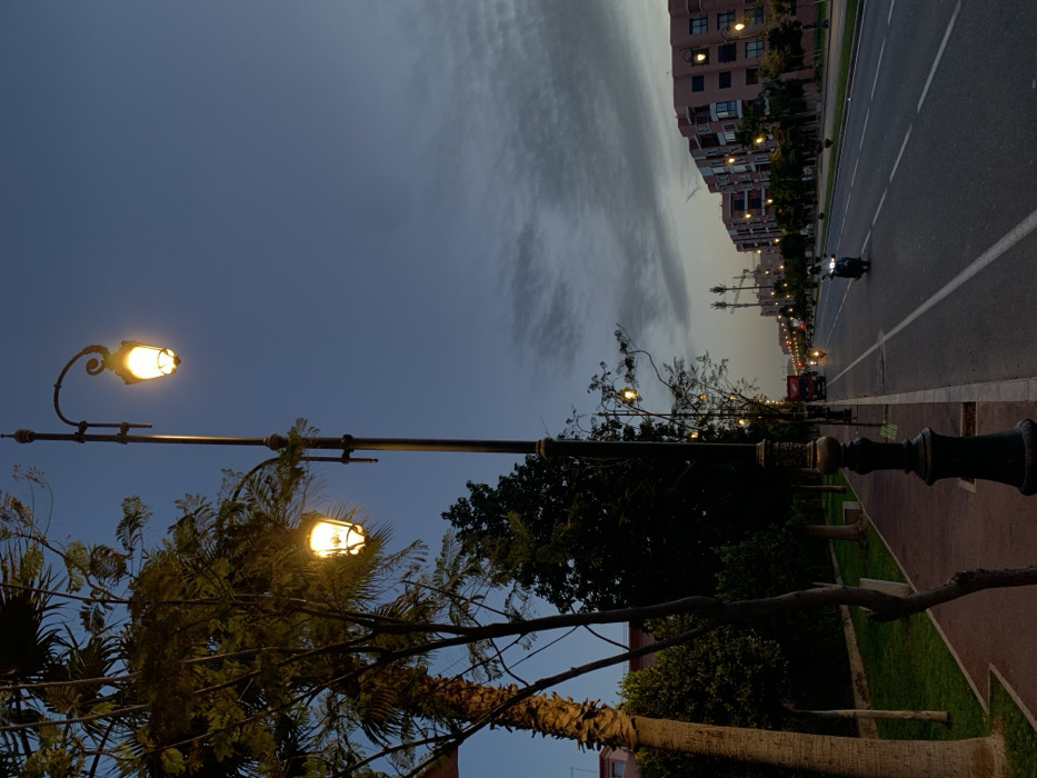 The image depicts an urban street scene in Marrakesh, Morocco, during twilight or early evening. In the immediate foreground on the left, an ornate black street lamp with two illuminated, decorative lanterns stands prominently. A paved sidewalk, bordered by a strip of green grass and a variety of trees including a large palm, extends along the left side of the frame. To the right of the sidewalk is a multi-lane asphalt road, marked with white dashed and solid lines. A single individual on a dark-colored scooter or motorcycle is visible in the closest lane, traveling from right to left, with its headlight on. Further down the road, a red truck and additional vehicles, all with their lights illuminated, are in motion. On the far right, across the road, a series of multi-story buildings with reddish-brown facades are visible, their windows and balconies subtly illuminated. More decorative streetlights line this side of the road as well. The sky, occupying the upper half of the image, transitions from a deep blue at the top to a lighter, cloud-streaked grey-blue near the horizon, indicating dusk or early night. Several telecommunication towers are visible in the distance beyond the buildings.