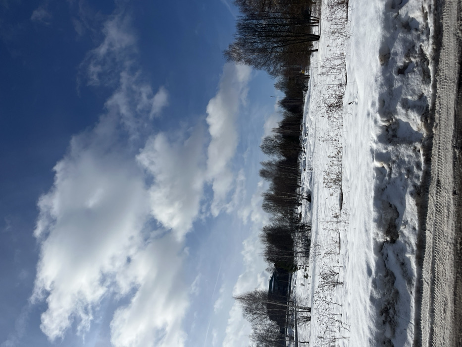 A winter landscape in Shevlyakovo, Russia, is depicted under a bright blue sky with scattered white cumulus clouds