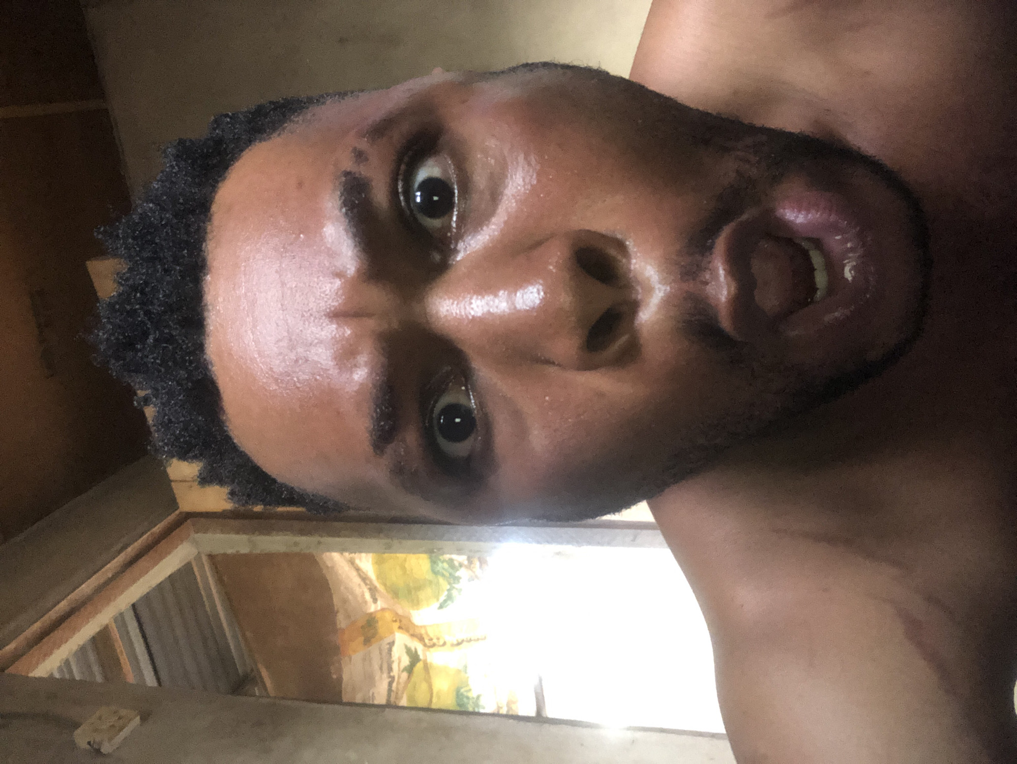A close-up, slightly angled portrait of a man with dark skin and curly black hair is presented. He is looking directly at the camera with wide eyes and an open mouth. His face appears shiny, possibly due to sweat. A section of a building interior is visible in the background, with wooden framing and light suggesting the presence of a window or doorway. The location is Unknown, Unknown.
