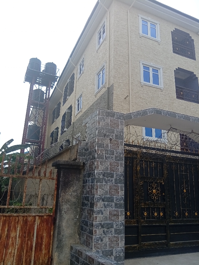 The image displays the exterior of a multi-story building in Umuode, Nigeria