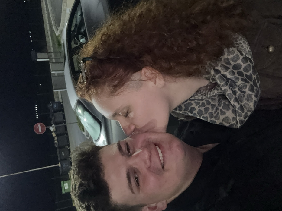 In Drazhevo, Bulgaria, an outdoor night scene depicts two individuals. A male with short dark hair, wearing a dark jacket, smiles towards the camera as a female kisses his right cheek. The female has long, curly reddish-brown hair with a shaved section on the left side of her head, sunglasses resting on top, and wears a patterned scarf and a dark jacket. Her eyes are closed during the kiss. In the illuminated background, a silver vehicle is parked behind the individuals. Further back, multiple dumpsters (one green, several dark grey and full) are visible alongside a red circular 'no entry' sign. A street light pole is present on the far left, and a dark fence extends horizontally across the middle ground. The ground appears to be a paved surface.