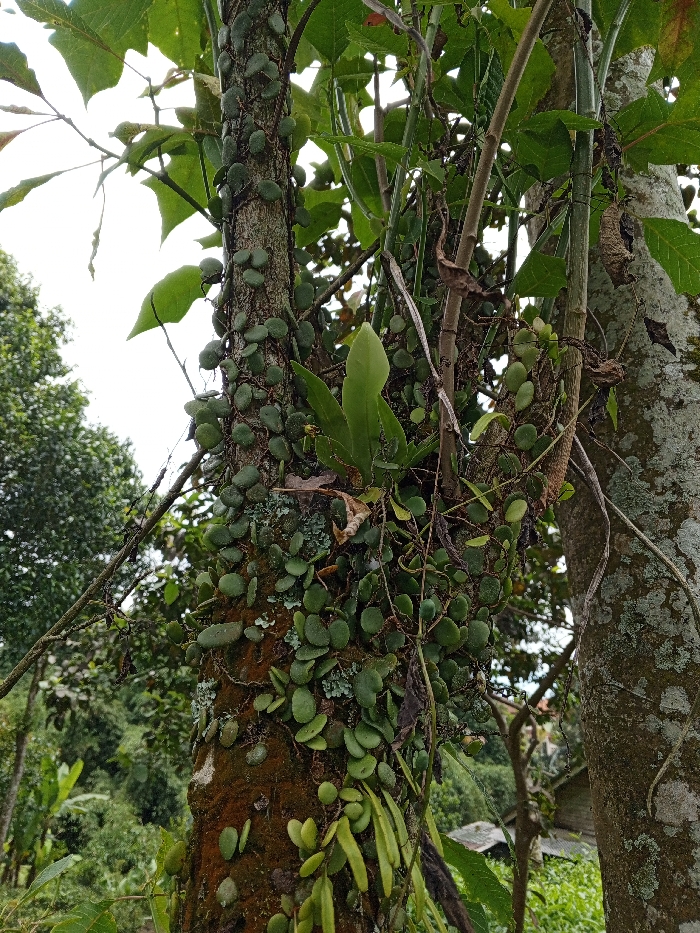 The image displays a close-up of a tree trunk situated in Calbayog, Philippines. The trunk is densely covered with numerous small, circular, bright green leaves of an epiphytic plant, likely *Pyrrosia piloselloides*, adhering to the bark. Patches of dark green moss and greyish-green lichen are visible on the exposed bark areas. Additionally, several larger, elongated green fern fronds emerge from the trunk, particularly on the lower right side. Thin, dark brown vines and branches are intertwined around the main tree and extend into the upper frame. The background on the left consists of dense green foliage from other trees. In the middle-right background, partially obscured by vegetation, a structure with a dark roof is faintly visible, suggesting proximity to human habitation. The sky, visible at the top and upper left, is overcast and appears uniformly bright white. The scene is illuminated by diffused natural light. No individuals or animals are present.