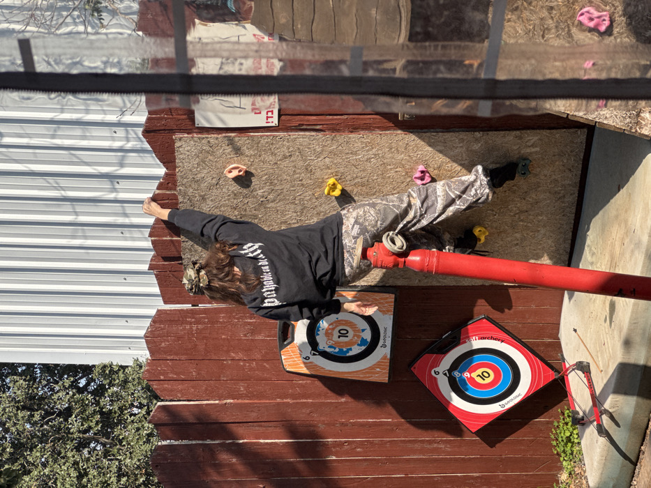 An individual, viewed from the back, is engaged in rock climbing on a vertical wooden panel (approximately 2