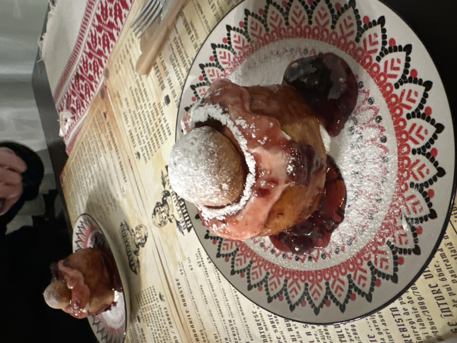 - "Two plates of traditional Romanian Papanasi dessert are centered on a dark wooden table within an indoor restaurant setting" by FM-GVzNi2, licensed under CC BY 4.0
