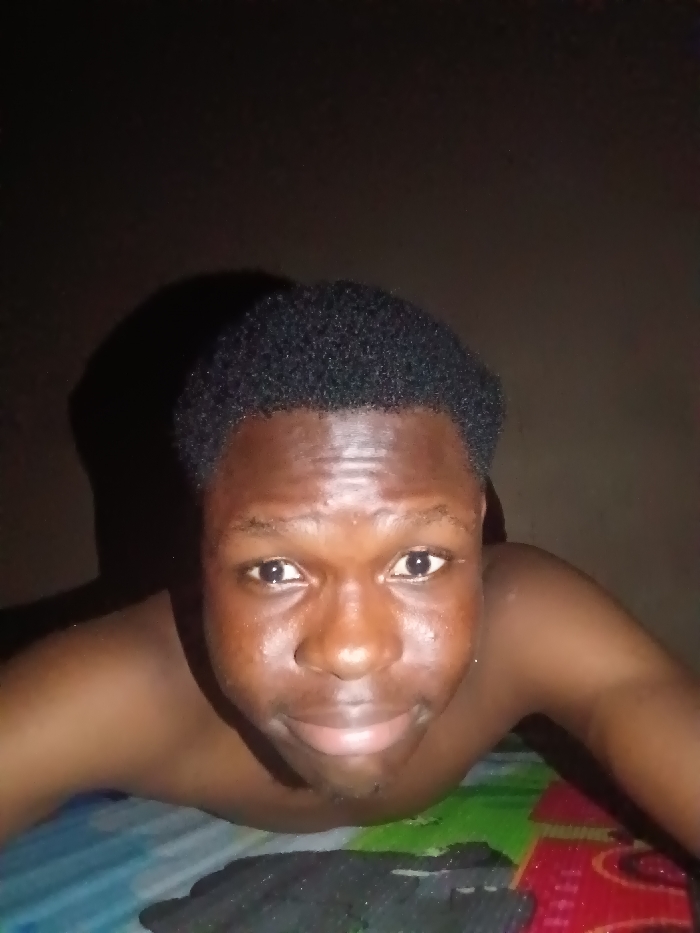 A close-up selfie of a young Black man. He has short, dark hair and a smooth, shiny complexion. He is shirtless and appears to be lying down on a surface with a colorful patterned fabric underneath. The background is dark and out of focus, creating a stark contrast with the man's face. The lighting emphasizes his features, giving his skin a slightly glossy look.