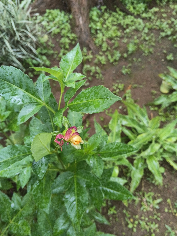 The image displays a close-up, top-down view of a single plant with a developing flower bud, situated in a garden within Ho Chi Minh City, Vietnam. The central subject is a herbaceous plant featuring numerous dark green, serrated leaves, all visibly wet with small water droplets. A prominent flower bud, partially unfurled, is positioned near the center of the frame. This bud exhibits reddish-pink or magenta outer petals/sepals, transitioning to yellow and orange tones at its core. The background consists of blurred elements: to the upper left, lighter green foliage is visible; to the right and bottom, dark brown soil with scattered smaller green plants or weeds is present. No people or animals are depicted. The scene suggests recent precipitation or artificial watering.