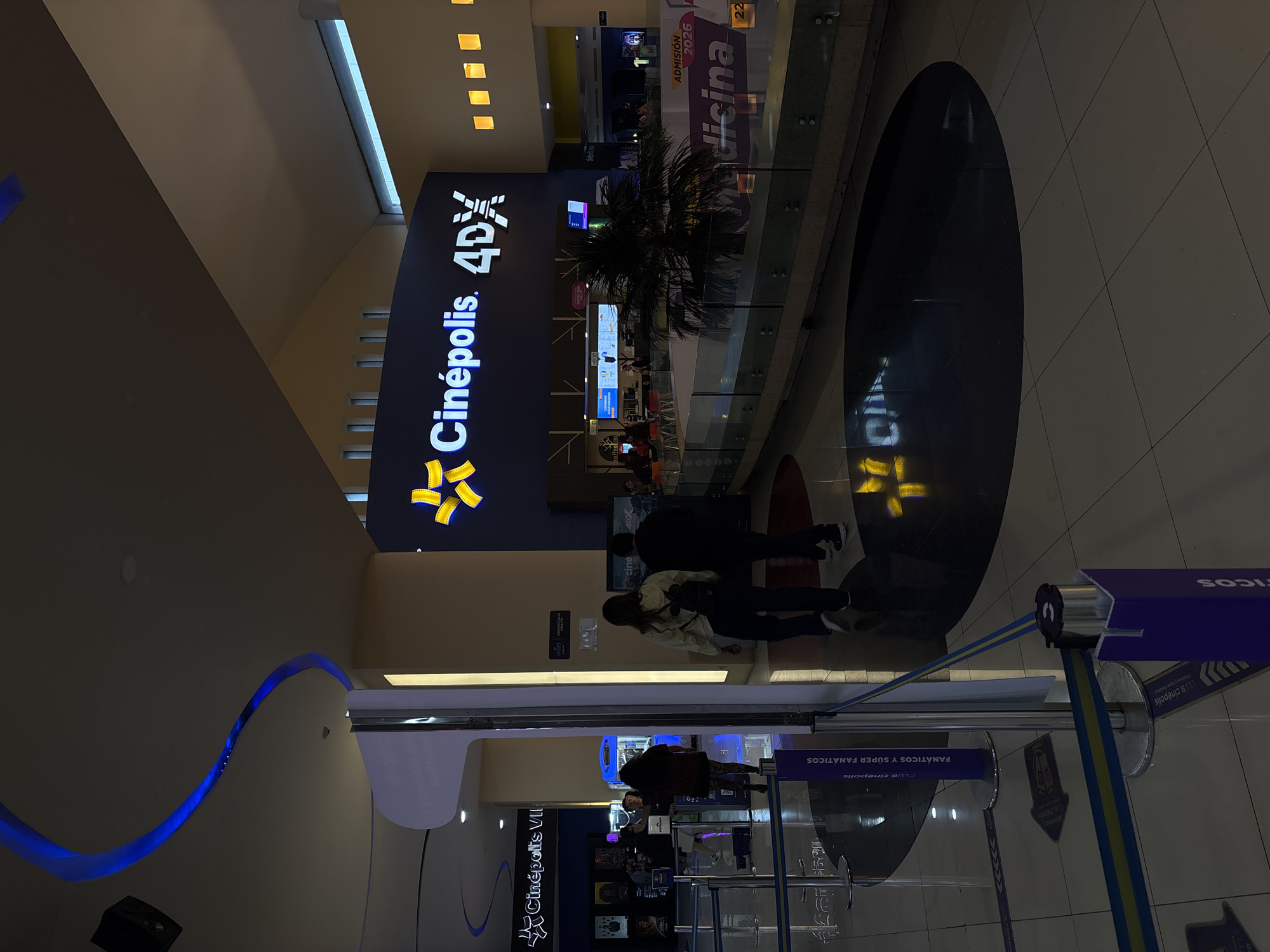 interior of a Cinépolis movie theater, specifically the Cinépolis 4DX in Puebla, Mexico. The view is from an elevated position, likely an upper level. Signage for "Cinépolis 4DX" is prominently displayed with the Cinépolis logo. There is a seating area with a decorative palm tree and a circular black floor design. Several people are visible, including a group walking towards the camera. There are retractable barriers with signage for "Club Cinépolis" and "Fanáticos y Super Fanáticos". Further in, there is another Cinépolis sign that reads "Cinépolis VIP" with what appears to be a movie posters on a wall. In the background, there is additional signage, including one indicating the "Admisión 2026" and "Medicina" a reference to the university. Overhead lighting is visible, along with a blue light decoration on the ceiling.