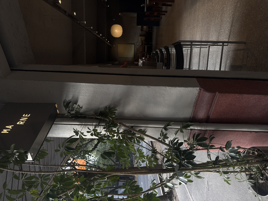 The image depicts an exterior view of a building with a sign that reads "MARNE". A sprawling plant with lush green leaves stretches across the foreground, partially obscuring the view. The building facade features a mix of gray and red brick elements. Inside, there's a softly lit interior with a hanging spherical lamp. A glimpse of what looks like clothing racks and a high-end fashion store is visible. The perspective is slightly skewed and the entire scene is dimly lit, creating a muted atmosphere.