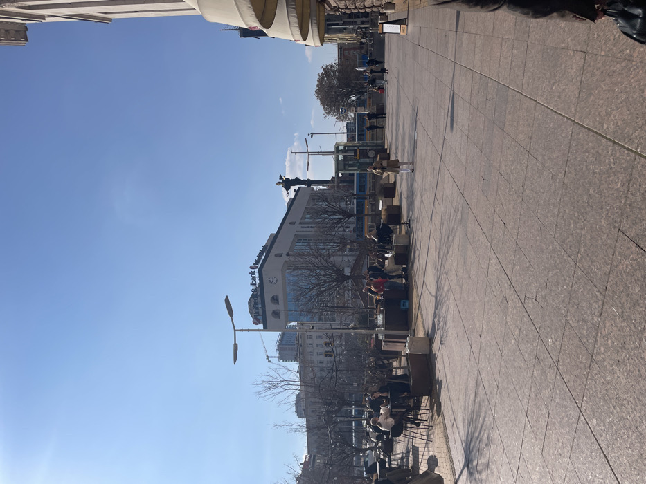 The image depicts a brightly illuminated urban pedestrian plaza in Sofia, Bulgaria, identified as Largo Square. The square is paved with large, reddish-brown granite tiles. In the mid-ground to the left, multiple groups of individuals are seated at dark-colored outdoor café tables with matching stools, engaging in conversation. Numerous bare-branched deciduous trees are interspersed throughout this seating area, indicating a late winter or early spring season. To the right of the café patrons, a cluster of approximately 5-7 individuals stands near a low structure or planter. Modern, dual-luminaire streetlights are present across the plaza. The background features several multi-story buildings under a clear, bright blue sky. Prominently centered is the UniCredit Bulbank building, characterized by its lighter facade, arched windows on an upper floor, and a large clock face, with its name clearly visible. To the right of this building stands the tall, dark Saint Sophia monument on a column. Further in the background, blue trams are visible, suggesting a tram route. A construction crane is faintly visible above the buildings on the far left horizon. A sole individual, dressed in a light-colored coat, walks away from the viewer in the mid-ground, traversing the paved plaza. Other pedestrians are visible further down the path. In the immediate foreground on the right, the partial view of a person's right arm and shoulder, clad in a dark jacket and holding a black bag, is observed. Shadows are cast by people and structures, consistent with direct sunlight.