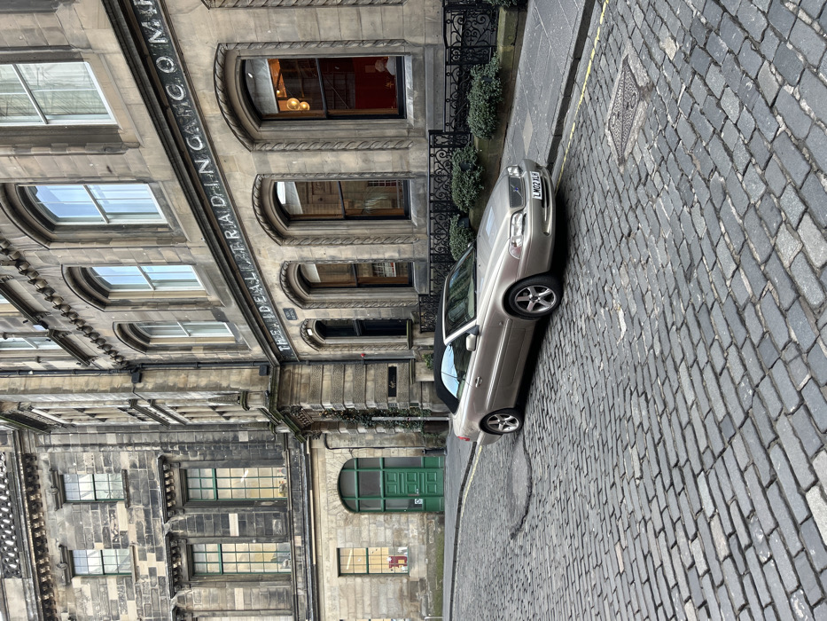 The scene depicts a static urban environment on a cobblestone street in the City of Edinburgh, United Kingdom. A light gold Volvo C70 convertible, bearing license plate LM02 XLB and featuring a black soft top, is parked parallel to the curb, facing right. To the immediate right, a multi-story stone building exhibits large arched windows on its ground floor. Inscribed lettering above these windows reads "THE IDEAL TRADING COMPANY," with "NORTH BRIDGE" also partially visible below. Behind a black metal railing and a line of low evergreen bushes along the sidewalk, a single individual is partially observable through the second ground-floor window from the right. This person appears seated, presenting their back or side to the viewer, and is wearing a light-colored garment. Interior lighting is active within this section of the building. To the left, a distinct multi-story building constructed from darker grey stone features several rectangular windows, some with green frames. A prominent green double door, topped with an arch, is visible on its ground floor. The street is paved with grey cobblestones, exhibiting minor surface irregularities, and a yellow line delineates the curb on the right side. The overall lighting is diffused, indicating an overcast daytime. No active movement or direct interaction between people or subjects is observed.
