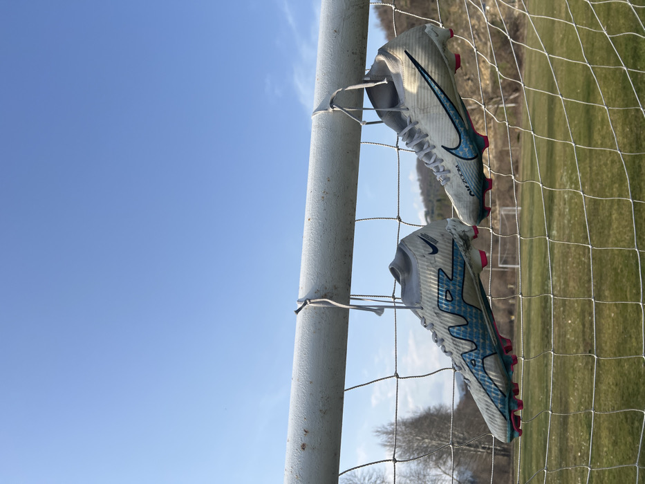 - "A pair of white Nike Zoom Mercurial soccer cleats, featuring blue graphic patterns and pink studs, are suspended by their shoelaces from the horizontal crossbar of a white, metal soccer goalpost" by FM-yFnm82, licensed under CC BY 4.0