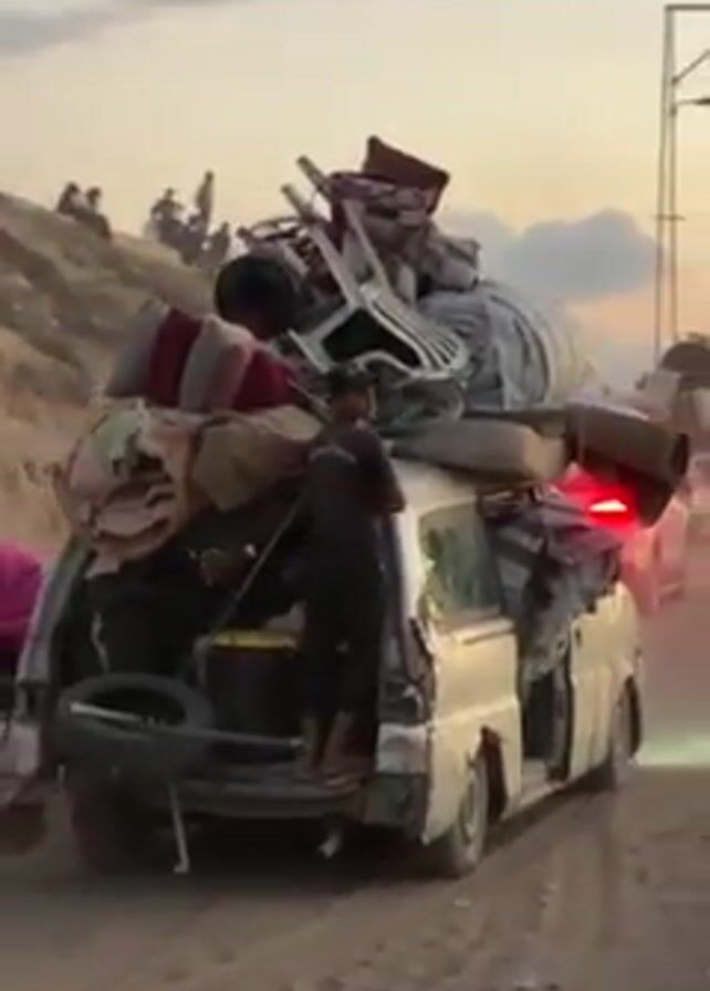dirt road with two heavily loaded vans, one white and one light yellow. The white van has bullet holes in its side. Both vans are carrying furniture, bedding, tires, and other household items piled high on top of them. One van is overloaded to the point that the rear door is open and a man is standing inside, holding onto the load. There are people walking alongside the vans and standing on a hill overlooking the road. The environment appears to be a rural or war-torn area, with a dusty landscape and setting sun.