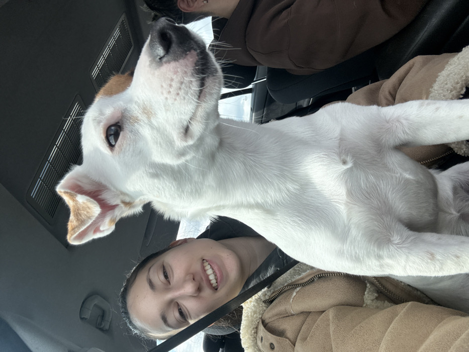 The image depicts the interior of a vehicle during daytime. A female individual, positioned on the left side of the frame, is smiling and looking towards the camera. She wears a light brown, possibly suede, jacket with a cream-colored shearling lining, over a dark garment, secured by a black seatbelt. A white dog, with short fur and distinctive tan markings on its ears and forehead, occupies the central foreground, oriented towards the right and looking away from the camera. Its nose is black. A second individual is partially visible on the far right side of the frame, wearing a brown hooded garment; only their head and shoulder are discernible. The vehicle's dark headliner and an overhead vent system with horizontal slats are visible. The specified location of Aldomirovtsi, Bulgaria, cannot be confirmed from the visual information within the image.