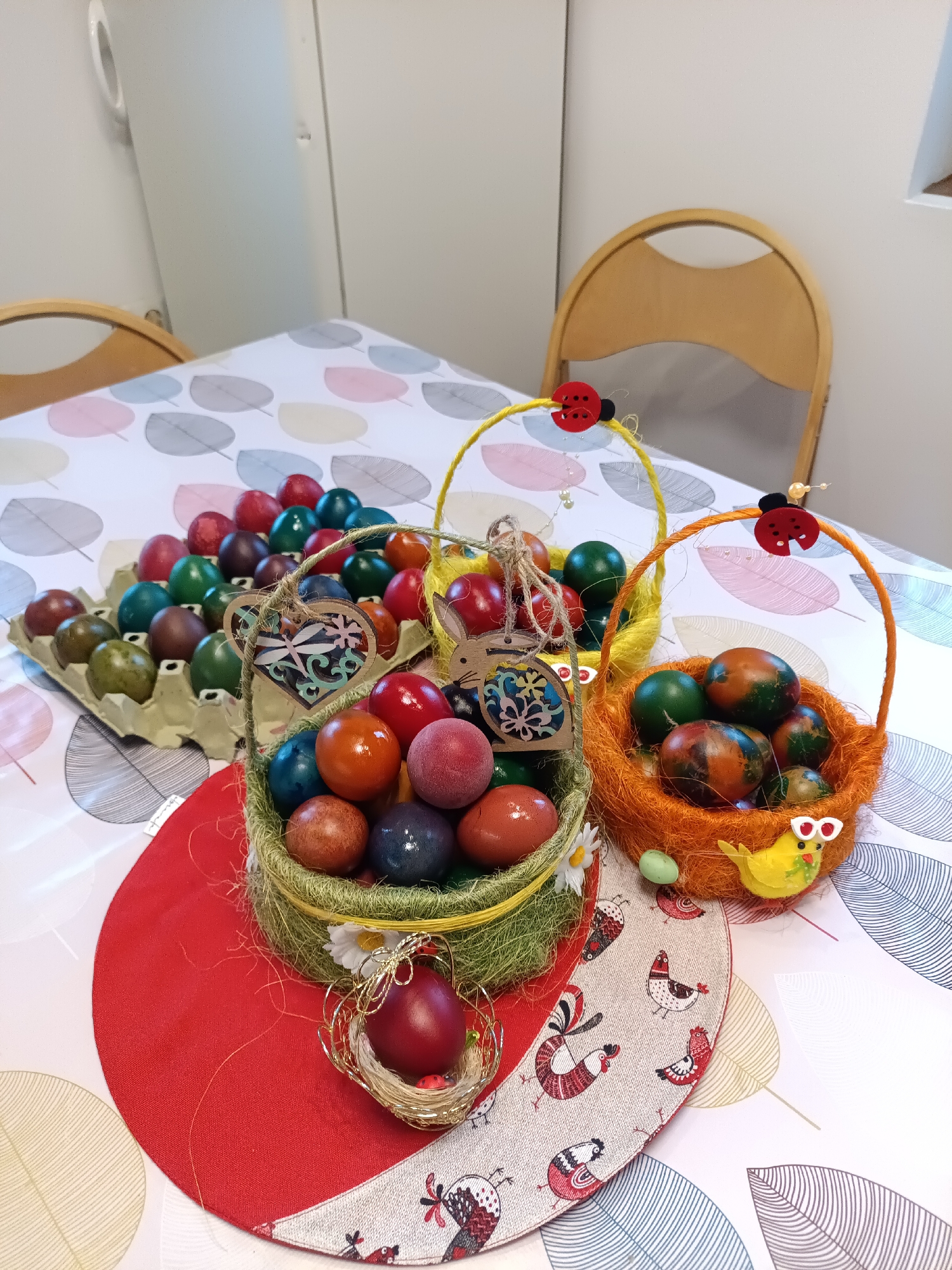 On a table covered with a patterned tablecloth featuring leaf designs, three baskets overflowing with Easter eggs are centrally positioned. The baskets are adorned with decorations, including ladybugs and a yellow chick. An egg carton filled with additional colored eggs is visible to the side. A decorative placemat with a red circular center and chicken patterns around the edge sits beneath the baskets. Two wooden chairs with curved backs are partially visible at the table. The location appears to be indoors.