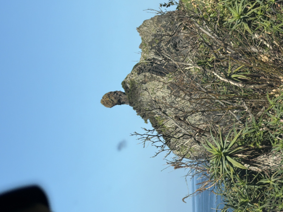 A rocky cliff edge juts towards a clear blue sky. Sparse, dry branches intertwine with succulent plants clinging to the cliff's edge. Below, a glimpse of the ocean appears. The rock formation features a smaller, rounded section at the tip, resembling a head. The overall composition highlights a stark contrast between the earthy tones of the landscape and the vibrant sky.