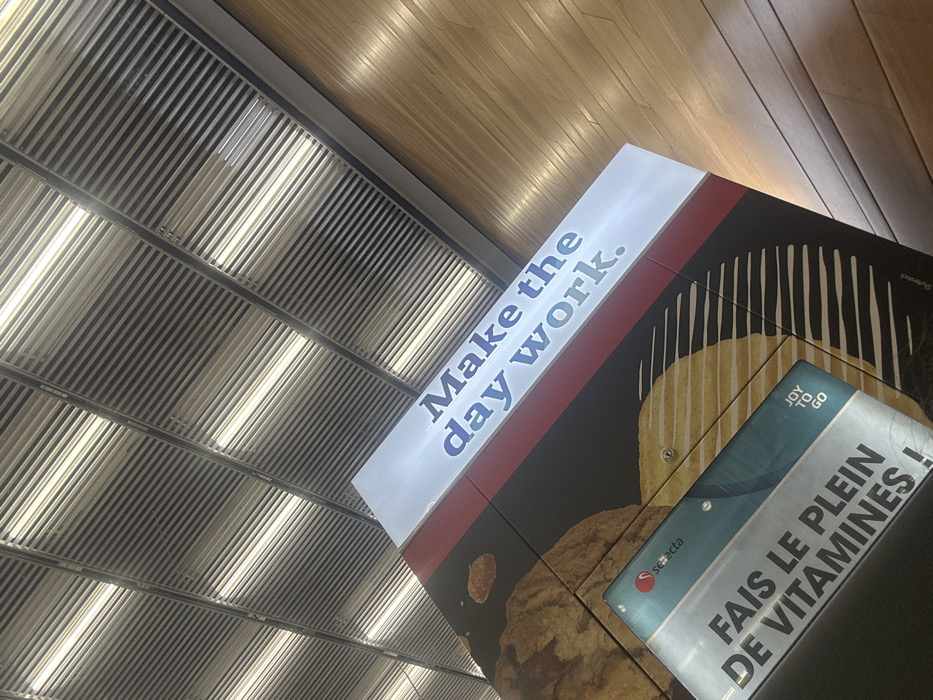 This image depicts a commercial display or vending machine located within a facility in Orly, France, likely an airport terminal. The photograph is taken from a low, upward angle, looking towards the ceiling and the upper portion of the display unit. The central subject is a brightly illuminated, multi-sided display unit, predominantly black with graphic overlays. The top panel of the display features the English slogan "Make the day work." in blue lettering against a white background. Below this, the display surface is decorated with large, stylized images of food items, including what appears to be a cookie or pastry on the left and a layered, circular item resembling potato chips or crackers on the right. A prominent rectangular panel, light blue-green in color, is visible on the lower left, displaying the French phrase "FAIS LE PLEIN DE VITAMINES !" (meaning "STOCK UP ON VITAMINS!"). This panel also features a "Selecta" logo in red and the smaller text "JOY TO GO". Above and to the left of the display unit, a modern ceiling structure is visible. It consists of numerous parallel, horizontal metallic slats with evenly spaced fluorescent strip lights running perpendicular to the slats, providing overhead illumination. To the right of the display, a warm-toned wooden paneled wall extends vertically. The floor is not visible. No people or active interactions are present in the scene.