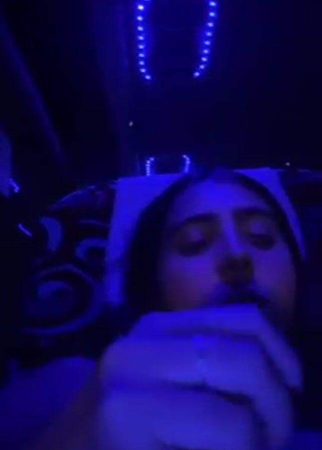 young woman lying down, eating from a container with a spoon. The lighting is dark blue, and there are strings of blue lights visible on the ceiling above her. A pillow with a patterned cover is behind her head. She looks directly at the camera as she eats. The setting appears to be inside a vehicle, possibly a bus or a car.