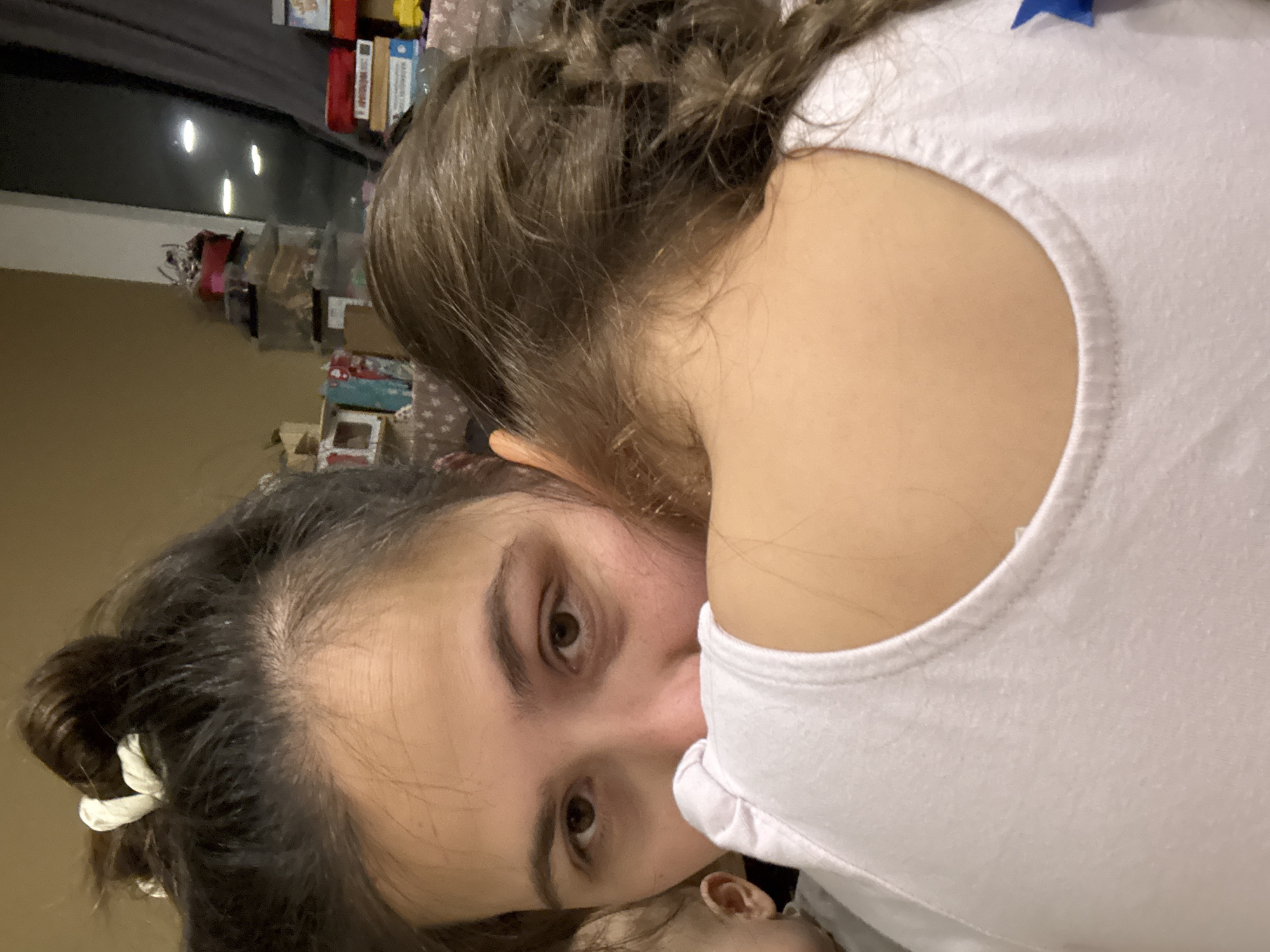 The image depicts a close-up of two individuals. One appears to be an adult female with brown eyes, and dark hair pulled back into a bun secured with a white tie. She is looking directly at the camera. Partially visible behind her is a child with brown hair braided and wearing a white shirt. The environment includes items such as boxes and books. The location cannot be determined from the image.
