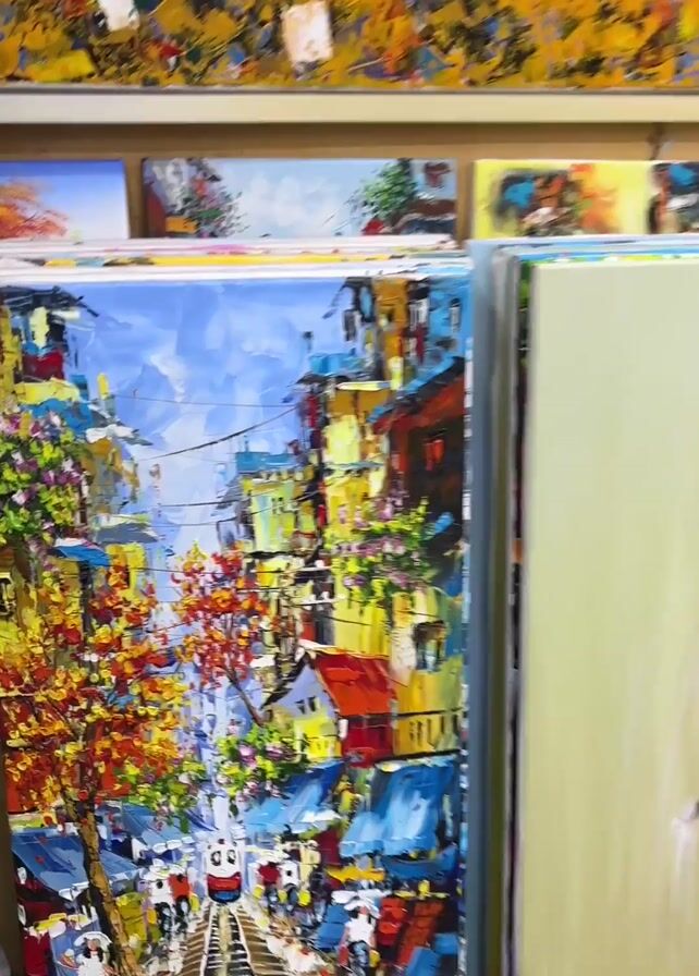 The camera moves through a gallery of colorful paintings. The paintings depict a cityscape with a train, a boat, landscapes, and portraits. The paintings are stacked on the floor and hanging on the walls. The gallery is well-lit. There are people talking in the background.