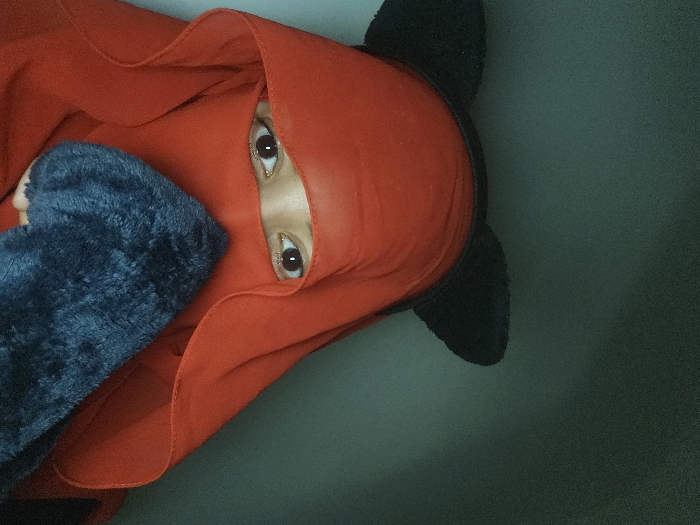 A person wearing a bright orange head covering with a niqab, revealing only their eyes. They are also wearing a black headband with black cat ears. They hold a soft, blue furry object close. The background is a muted green. The image is shot close-up, showing only part of their body, with the person slightly tilted in the frame.