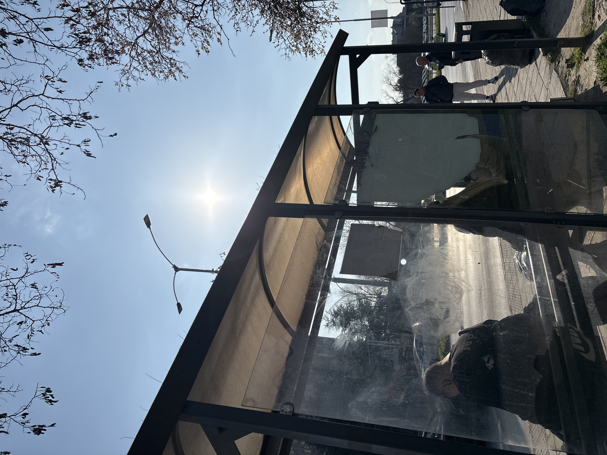 The image depicts an urban scene at a bus stop in Varna, Bulgaria, under a clear, bright sky with strong direct sunlight. The bus stop features a dark metallic frame, a translucent, light-colored arched roof, and transparent glass side panels. These glass panels are heavily smudged, streaked with dirt, and one central panel exhibits significant damage or is obscured by an opaque white material with visible cracks. Inside the bus stop, a male individual with short dark hair is seated on a metallic bench bearing a white "NIKE" logo. He is positioned with his back to the viewer, wearing a dark, long-sleeved shirt with a partially visible white graphic on the rear shoulder area. Outside the bus stop, on the paved sidewalk to the right, two adult males are standing. The man closer to the foreground wears a dark jacket, light-colored pants, and light sneakers. The second man, positioned slightly behind him, wears a dark jacket and dark pants, appearing to face towards the street. A dark public waste bin and several dark trash bags are located on the sidewalk near these individuals. The environment includes a streetlamp with two luminaires visible against the sky, positioned behind the bus stop. Bare tree branches with dark, elongated seed pods are visible in the upper left, while a tree with sparse, light-colored blossoms is on the upper right. The sun's glare is prominent, reflecting off the bus stop's roof and the street surface. In the background, beyond the road, vehicles are discernible, and multi-story buildings line the horizon. The ground directly surrounding the bus stop consists of a paved sidewalk and small patches of sparse grass and exposed soil.