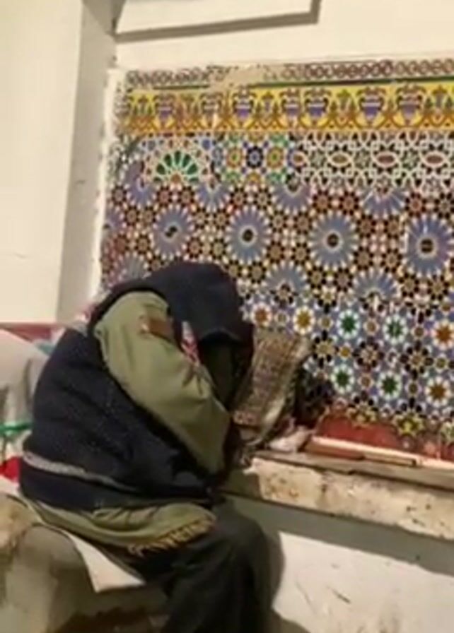 person sitting on a bench in what appears to be an indoor space. The person is wearing dark pants, a light-colored shirt, and a dark vest with a hood that is up, obscuring their face. They are leaning forward, their head resting on their arms. Behind the person is a wall decorated with colorful mosaic tiles in a geometric pattern. There is a white shelf above the tiles. The bench is upholstered in a light-colored material, and there are some items placed on the windowsill next to the person. The room is dimly lit.