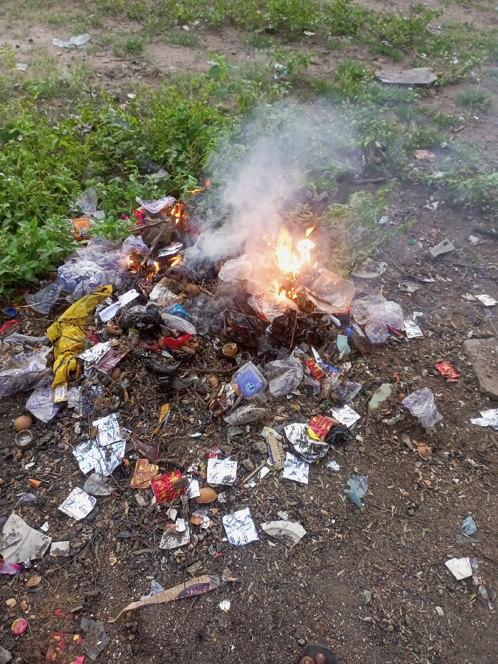 In Zango-ndaji, Nigeria, a refuse fire is observed on an unpaved, dirt ground surface. A substantial pile of mixed waste, consisting of transparent and colored plastic bags, foil wrappers, cardboard fragments, and organic debris, is actively combusting. Visible flames are concentrated on the right side of the pile, while a dense plume of white-grey smoke rises from the center. A yellow textile item is discernible on the left side of the burning heap. The immediate environment includes scattered trash, small stones, and dry organic material on the dark earth. Green shrubbery and weeds are present in the background and to the left of the burning refuse. A human foot, encased in a dark-colored sandal, is partially visible in the lower right foreground.