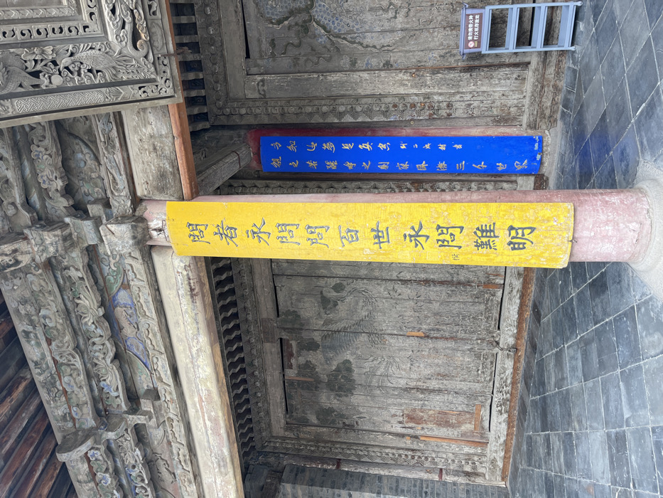The image depicts a detailed view of a weathered section of the Giant Buddha Temple in Zhangye, China. A central, reddish-brown wooden pillar stands prominently, supporting an overhead architectural element. Attached to this pillar is a vertical yellow wooden plaque displaying black Chinese characters. Directly behind the pillar, two large, aged double wooden doors are visible, featuring faded, possibly carved or painted, designs. Above the doors, an elaborate wooden lintel and carved corbel brackets show remnants of faded green, blue, and red paint, indicating significant wear. To the right of the central pillar, a portion of another reddish-brown wooden pillar is visible, to which a narrower, vertical blue wooden plaque with white Chinese characters is affixed. The ground is paved with dark grey square tiles. On the far right, a small, grey multi-tiered metal rack holds a white sign with red Chinese characters and a fire safety symbol. A partial brick wall is visible on the far left. No individuals, animals, or discernible actions or interactions are present in the scene.