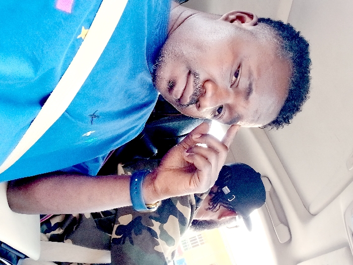 The image displays two males inside a vehicle in Gweta, Botswana. In the immediate foreground, a male with medium-dark skin, short dark curly hair, and light facial stubble is looking directly at the camera. He wears a bright blue t-shirt featuring small embroidered motifs, including a dark figure, a light blue polo player, and a yellow star with a pink rectangle. A light-colored seatbelt crosses his chest diagonally. His right index finger is positioned against his forehead, and a dark blue wristband is visible on his left wrist. Behind him, another male is partially visible, facing away from the camera. This individual wears a camouflage jacket and a black baseball cap worn backward, revealing dark dreadlocks or braids. The interior of the vehicle shows a light-colored headliner and trim.