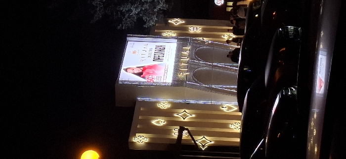 The image depicts an urban street scene at night, focusing on the brightly illuminated entrance of a building identified by the name "RITUAL." The building's facade on either side of the entrance features vertical panels adorned with evenly spaced, glowing outlines of playing card suits (spades, diamonds, clubs, hearts) in a warm yellow light. The main entrance, inscribed with "RITUAL" in white illuminated letters, is framed by vertical strips of white light, forming an arched design. Above the entrance, a large digital display screen is active, showing an advertisement. The advertisement features a woman with long dark hair, wearing a red or pink garment, positioned on the left side of the screen. Text on the right side reads "RITUAL," "30.09 Thu," and "ПРЕСЛАВА," alongside a "50%" graphic, indicating an event or performance. In the foreground, multiple dark-colored vehicles are parked or stationary, partially obscuring the lower portion of the building. Reflections of the digital display are visible on the surfaces of these vehicles. A cluster of indistinct individuals is visible near the building's entrance, suggesting pedestrian activity. To the far left, a distinct circular yellow-orange light source, likely a streetlamp, is present. Dark tree foliage is visible against the night sky on the right side of the frame. The location is an unknown city street.