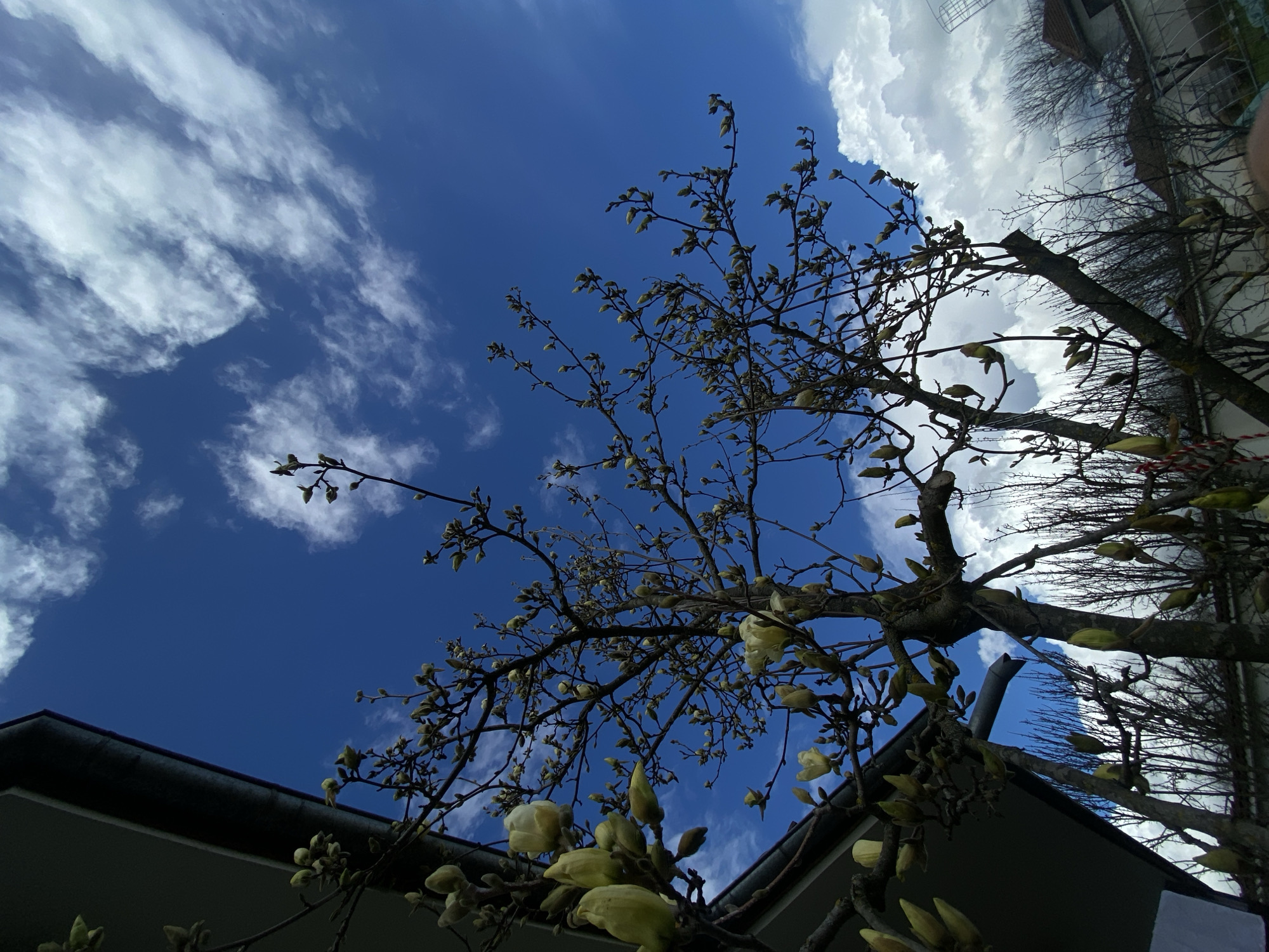 - "The image captures a view looking up at a flowering tree against a blue sky with scattered white clouds" by FM-PFEbq2, licensed under CC BY 4.0