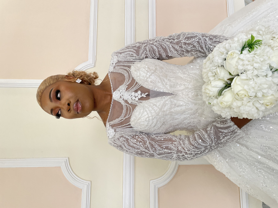 An adult female subject is depicted in an indoor setting, specified as Barakin Lerawi, Nigeria. The subject has dark skin, blonde hair styled in an updo, and wears full makeup including prominent false eyelashes, groomed eyebrows, and glossed lips. She is wearing a long-sleeved, white bridal gown heavily embellished with beads and sequins. The gown features sheer, beaded sleeves, a sweetheart neckline beneath a sheer overlay with intricate beadwork forming decorative draped strands and a central appliqué, and a deeply plunging V-cut in the bodice. The skirt is voluminous and sequined. She wears white, rectangular stud earrings. In her hands, she holds a large, cascading bouquet primarily composed of white roses and white hydrangeas, with minimal green foliage visible. The subject is gazing upwards and to her right. The background consists of a light-colored wall, possibly cream or pale yellow, adorned with white decorative architectural molding that frames panels, some of which contain a pale peach tint.
