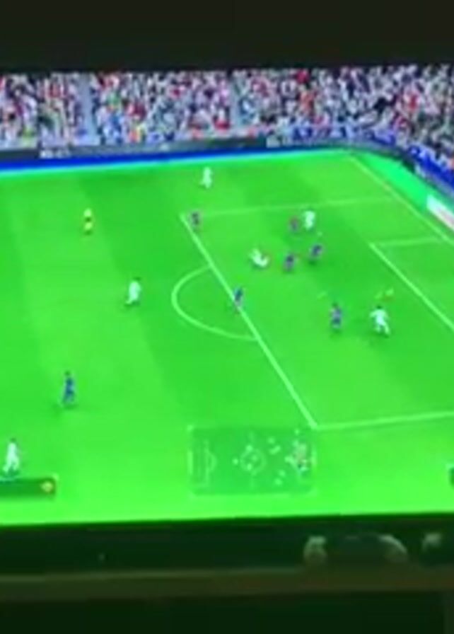 A TV displays a soccer video game, where a player tries to score a goal. The game shows players on the field, with spectators in the background. The perspective switches to a closeup of the goalkeeper arguing with another player. A PS5 is visible to the left of the TV, and two game controllers sit below the TV.