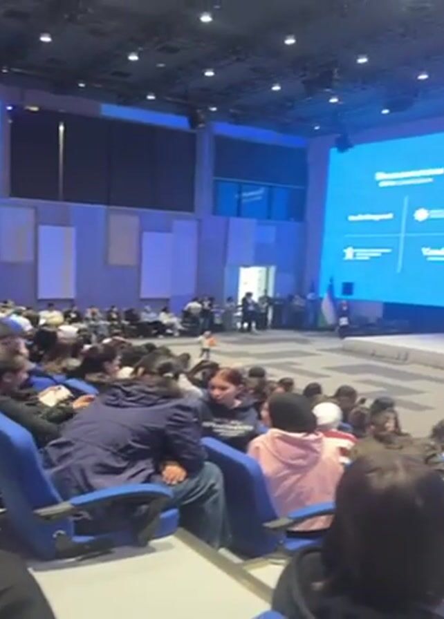large auditorium filled with people seated in rows of blue chairs. The room is brightly lit with ceiling lights. At the front of the auditorium, there is a large screen displaying text and images. A few individuals are visible on the stage in front of the screen. The audience members are looking towards the stage, and some are holding up their phones, possibly recording or taking pictures. The atmosphere appears to be that of a presentation or a conference. There is music playing in the background.