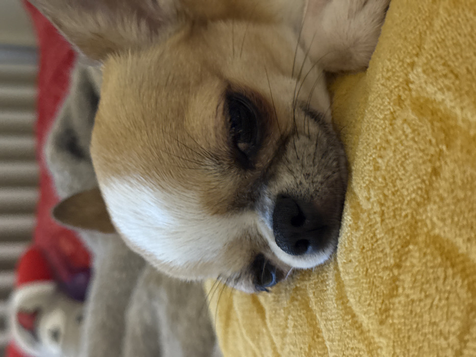 The scene is set in a domestic interior within Berlin, Germany. A small, short-haired dog, identifiable as a Chihuahua or similar toy breed, is positioned in a close-up, eye-level shot. The animal's fur is predominantly light tan or cream, featuring a distinct white stripe extending from its forehead down the center of its muzzle. Its dark eyes appear partially open, indicative of a resting or sleepy state, with its head turned slightly to the left. A black nose and visible whiskers contribute to facial detail. The dog is lying on a yellow, textured textile surface, consistent with a blanket or towel. The background is out of focus, displaying blurred masses of red and grey fabric, and faint vertical lines suggesting a structural element such as a headboard or radiator. No human subjects or discernible interactions are present in the frame.