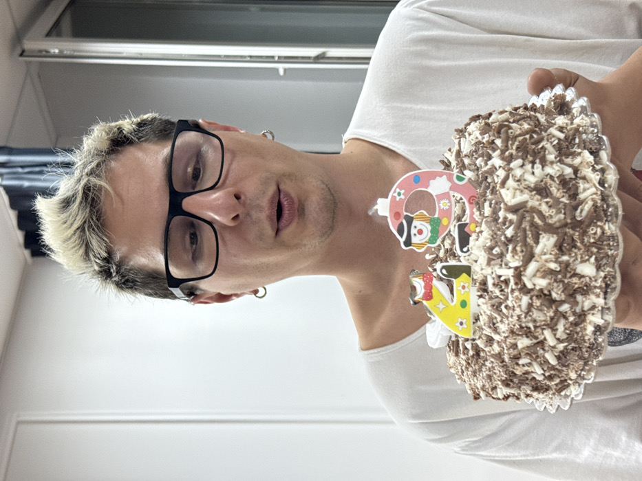- "A male individual is depicted in a close-up, chest-up shot, holding a round cake adorned with birthday candles, and appears to be in the act of blowing them out" by FM-fASGr2, licensed under CC BY 4.0