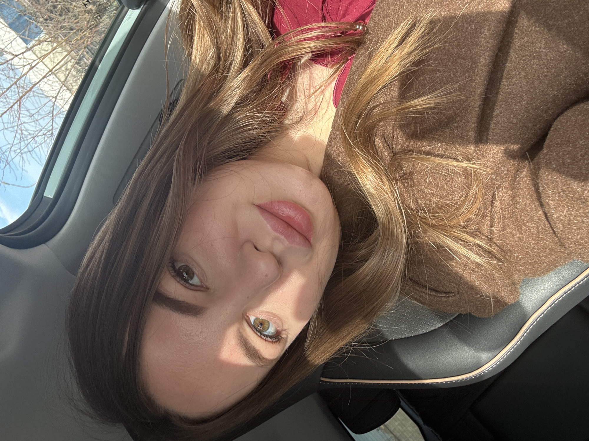 A female individual is depicted in a close-up, self-portrait taken inside a vehicle, located in the city of Orekhovo-Zuyevo, Russia. She is seated in what appears to be a black car seat with light trim and stitching. The individual has long, brown hair with lighter highlights, parted on the left, and styled to fall over her right shoulder and chest. Her left eye, appearing hazel with a prominent pupil, is clearly visible, and her lips are full and slightly parted. She is dressed in a dark red garment overlaid by a brown, wool-textured coat. Direct sunlight illuminates the left side of her face and hair, casting a sharp shadow across her features. Through the vehicle's window, a clear blue sky, bare deciduous tree branches, and a light-colored building are visible, indicating an outdoor daytime setting.