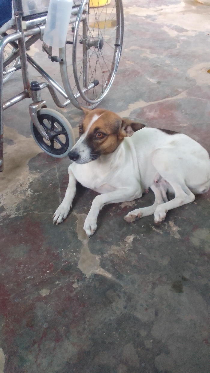 - "A white and brown dog lies on a concrete floor next to a wheelchair" by FM-m1OBG3, licensed under CC BY 4.0