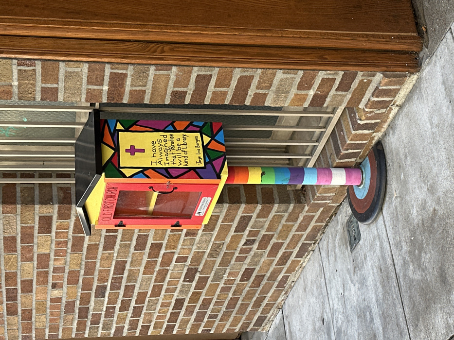 A colorful Little Free Library is mounted on a painted rainbow pole next to a brick building. The library box is painted with bright geometric designs on top and “Old First Church” written on the side. A sign on the top box says, “I have always imagined that Paradise will be a kind of library.” followed by the author Jorge Luis Borges' name. The pole is secured to the ground by a round metal base.